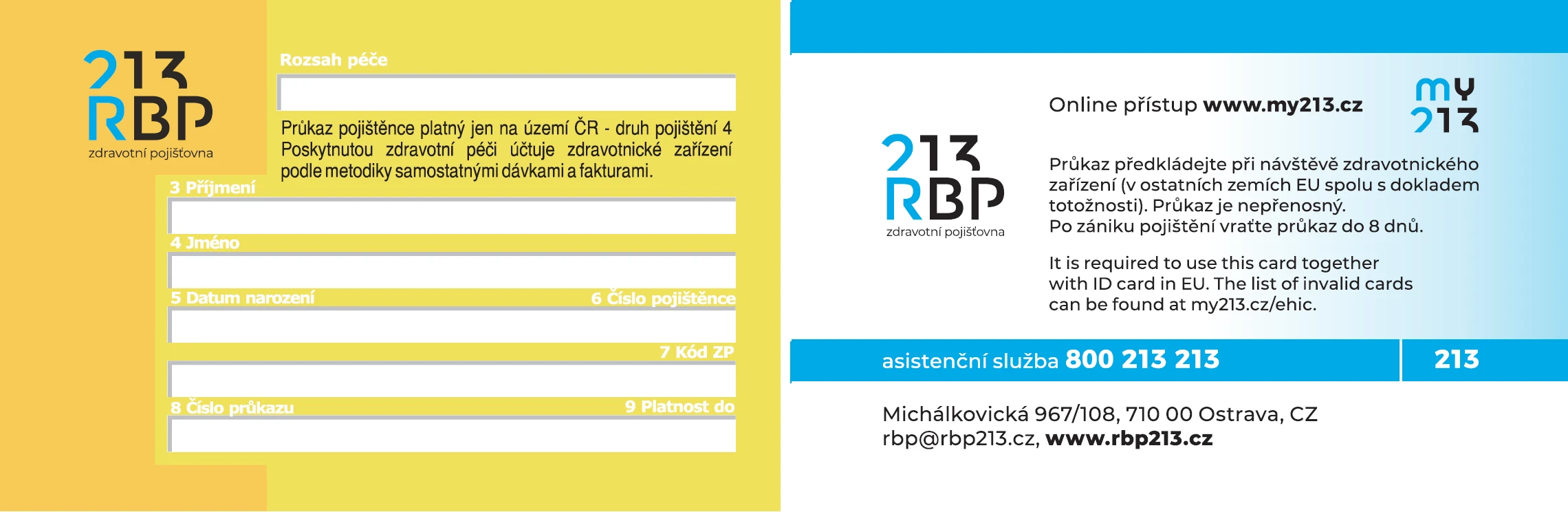 Plastová karta, na čelní straně modrá. Tento průkaz je vydáván od 1. července 2004, je nepřenosný. Od listopadu 2013 je rubová strana doplněna o telefonní linku na kontaktní centrum. Od listopadu 2015 je rubová strana v nové grafické podobě doplněná o nabídku elektronické komunikace prostřednictvím 'MojeRBP“. Od ledna 2019 je rubová strana světle modrá, doplněna o nové logo RBP i nové logo online služeb my213. Průkaz kromě ČR platí i ve všech státech Evropské unie, EHP a Švýcarsku, které jej respektují, jeho užívání požaduje i Makedonie.